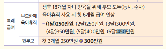 즉, 부부가 전략적으로 육아휴직을 나눠 쓰면 월 최대 450만 원까지 수령 가능합니다.