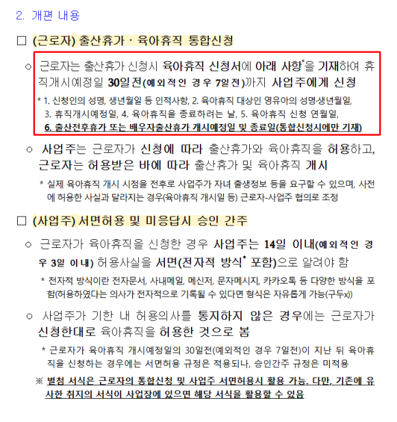 - 육아휴직 예정일 30일 전까지 신청서 제출 (긴급 시 7일 전까지 가능)